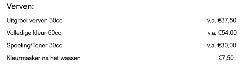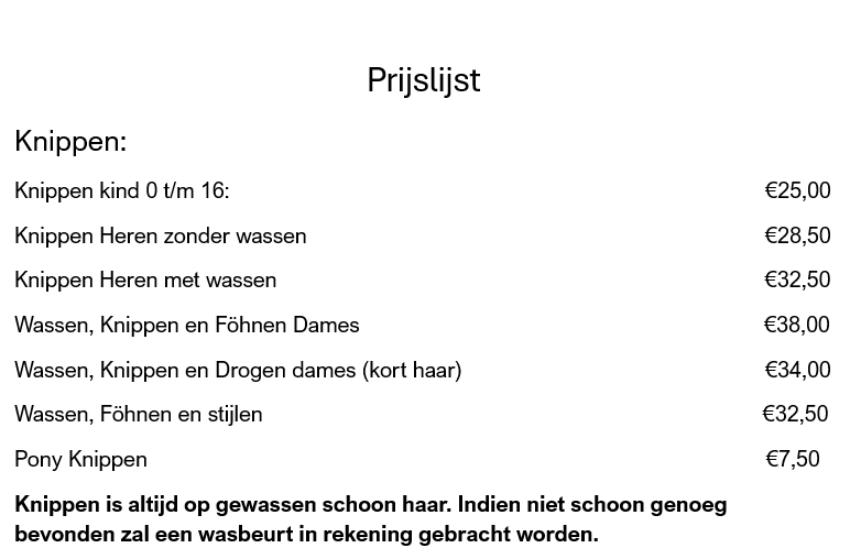 Ontdek onze transparante en toegankelijke tarieven, speciaal samengesteld om iedere klant een passende en persoonlijke haarbeleving te bieden. Elk behandeling is ontworpen met aandacht voor kwaliteit, comfort en de professionele producten waar Mooi Haar door Nanja mee werkt, zoals Juuce en Pure.
